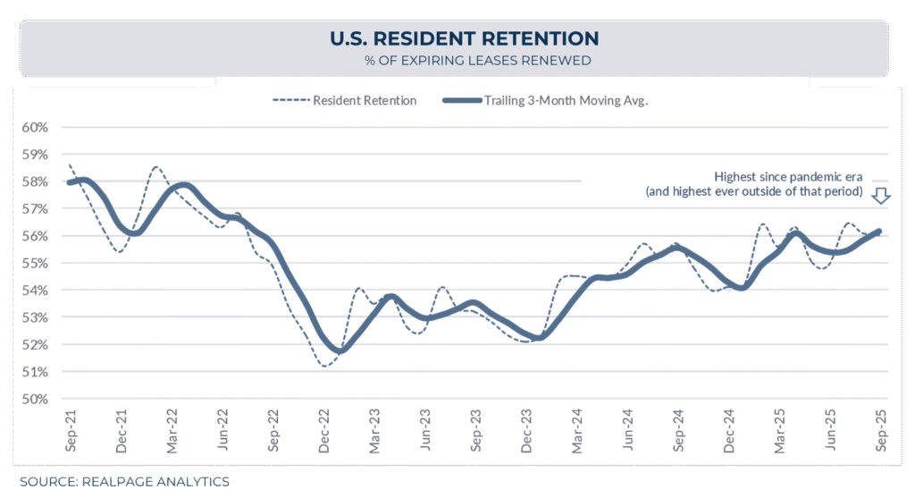 National occupancy remains near record highs at 95.36%. This is the second highest occupancy reading since Q2 2022, only eclipsed by last quarter occupancy of 95.64%. Flat rent growth combined with high occupancy signals that operators are focusing on keeping current tenants rather than increasing rent. This is evident in the current retention rate of 56%, this is the highest since the pandemic era and well above the historic average of ~50%.