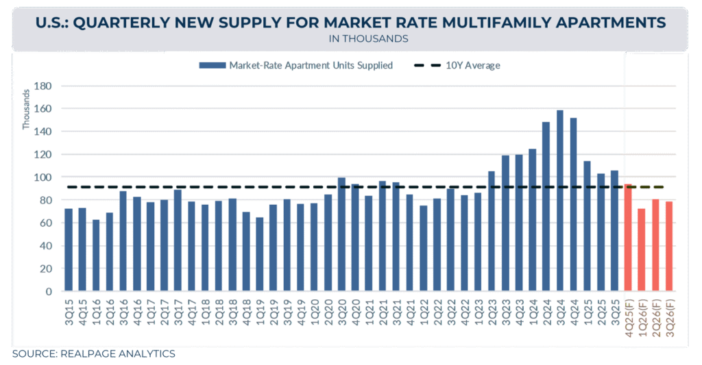 Below illustrates the number of new apartments delivered along with a 2026 forecast compared to the 10-year average.