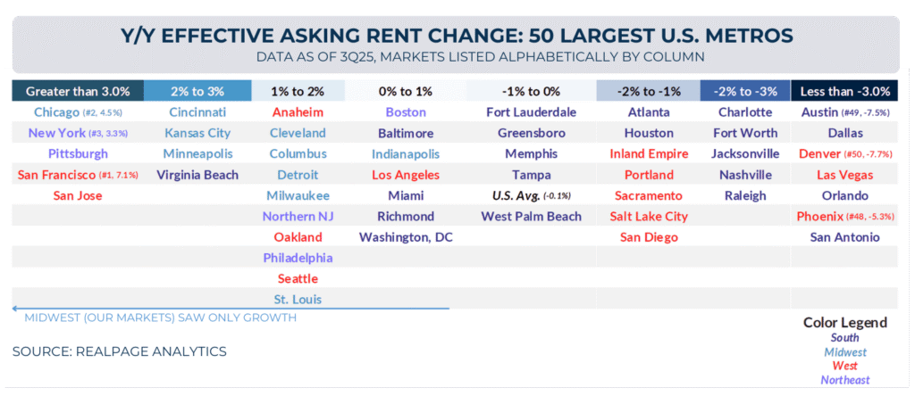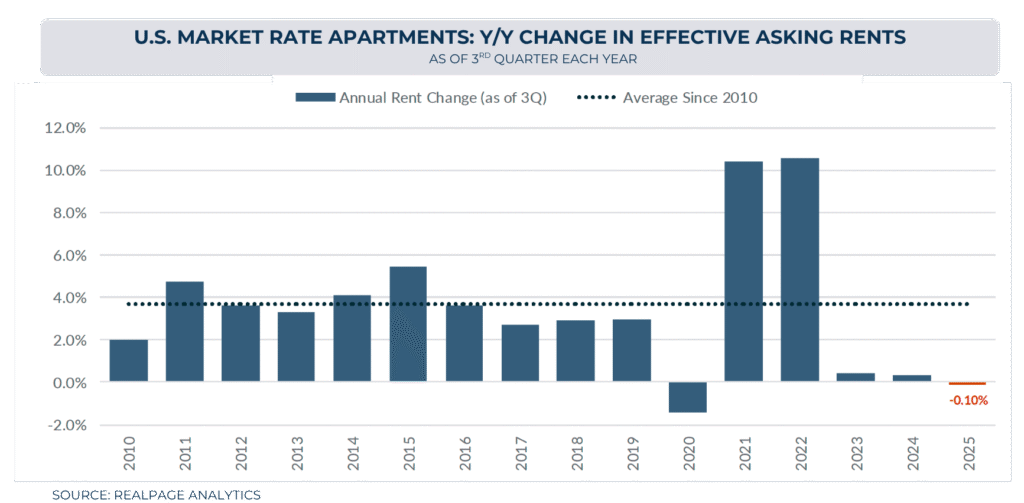 National rent growth was effectively flat at -.1% year over year—a recalibration after unprecedented pandemic-era increases, and notably better than the significant declines seen in 2020.