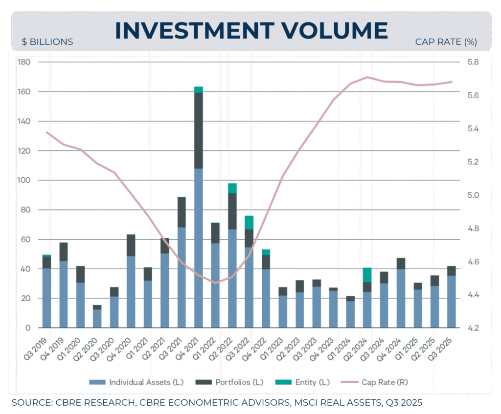The multifamily investment market remains attractive relative to other sectors, accounting for the largest share of total commercial real estate investment volume in Q3 at 38%. In terms of pricing stability, the average multifamily cap rate remained stable at 5.7% in Q3 2025. This stability in pricing and improving transaction volume indicates that apartments remain a favored target for investors moving capital out of other asset classes.